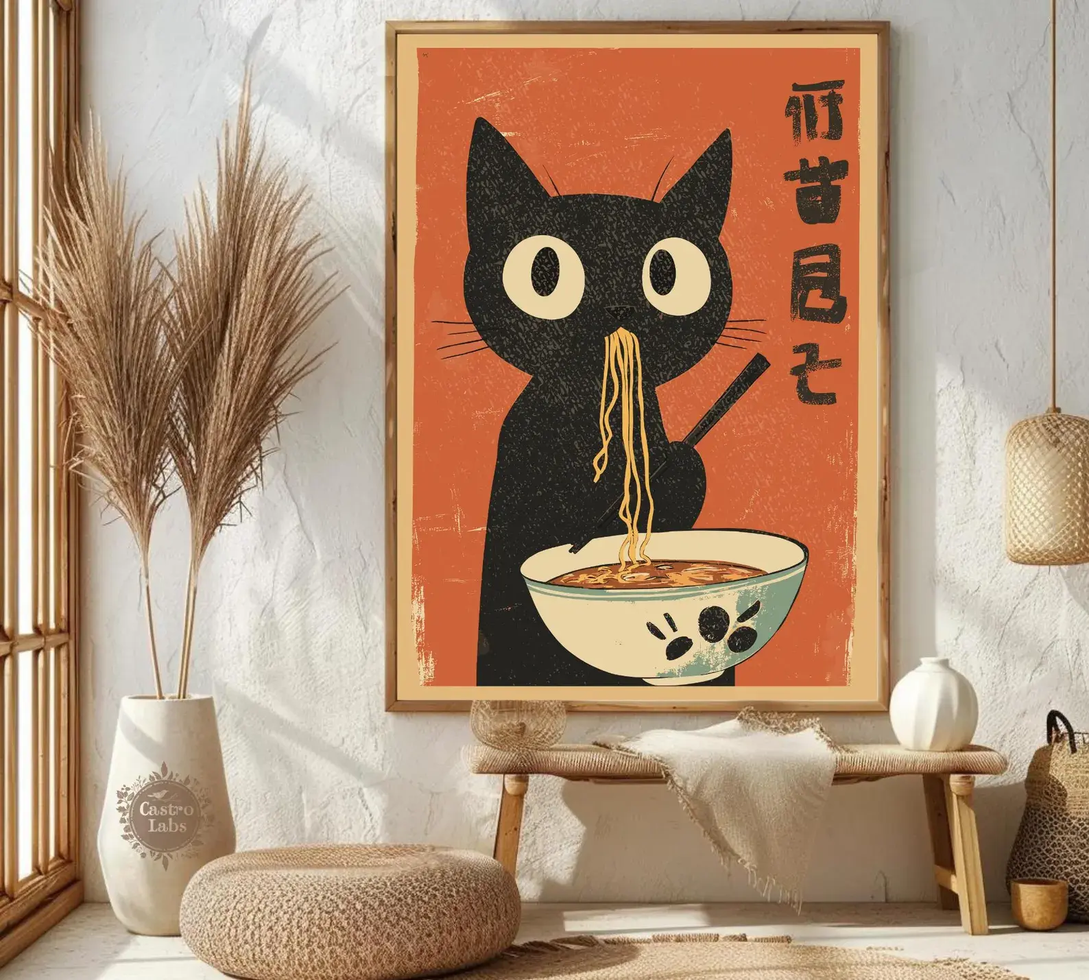 When hunger strikes, even cats can’t resist ramen! This Hungry Cat Ramen Print features a stylish black cat caught mid-noodle-binge, set against a vintage Japanese backdrop that oozes personality. It's the perfect mix of funny, artsy, and foodie-friendly wall decor.