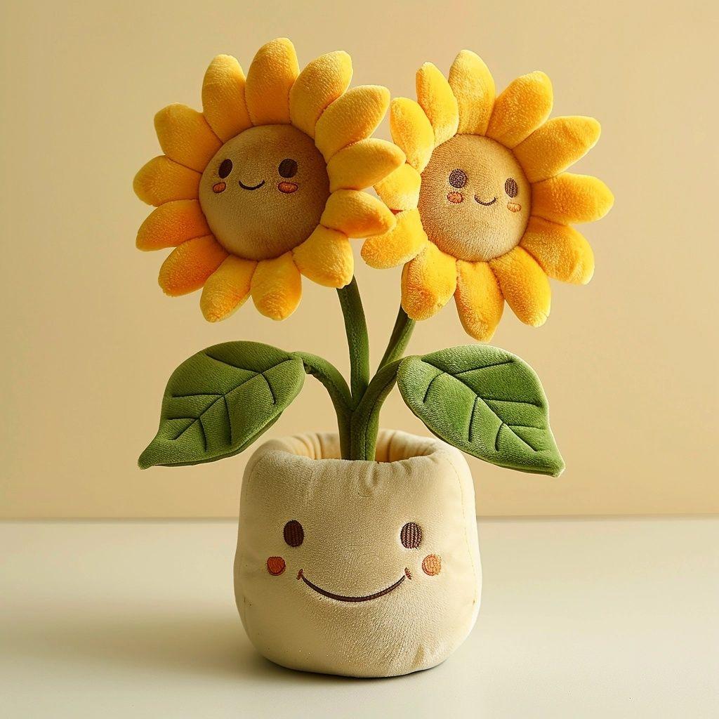 Brighten any room with this adorable sunflower plush toy featuring two smiling blooms and a happy-faced pot. Made from ultra-soft fabric with stitched details on the leaves and petals, this cuddly creation brings warmth and positivity to your space. Perfect for gifting, nursery décor, or adding a playful touch to your desk or shelf. Its vibrant yellow petals and friendly expressions make it a heartwarming companion for all ages.