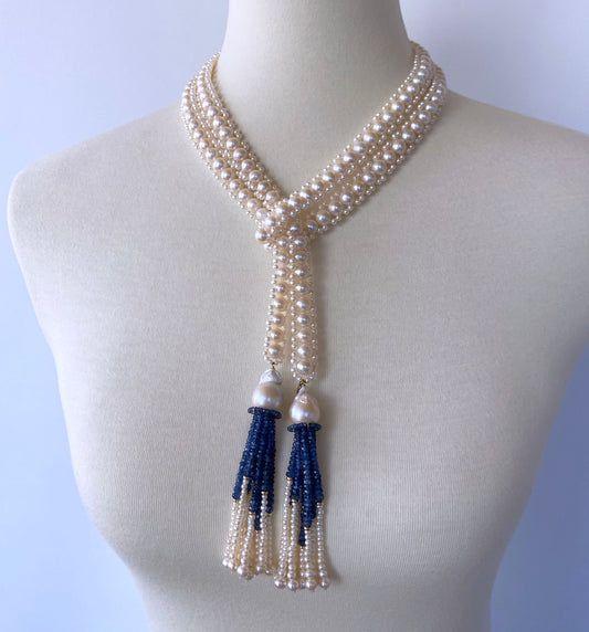Title: Elegant Pearl and Sapphire Blue Beaded Lariat Necklace Set