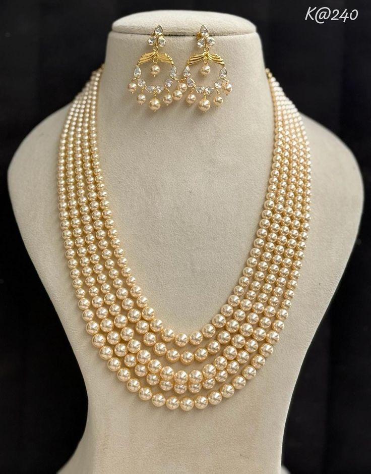 Adorn yourself in timeless elegance with this breathtaking pearl jewelry set. The stunning necklace features five gracefully layered strands of lustrous, champagne-colored pearls, creating a rich and opulent statement piece that beautifully frames the neckline