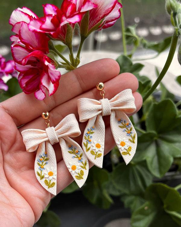 Delicate Bow & Embroidered Daisy Polymer Clay Earrings - Romantic Floral Dangles