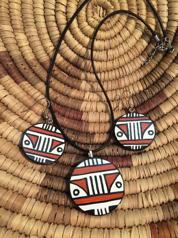 Celebrate tradition with a modern twist through this Tribal Harmony Jewelry Set, featuring a handcrafted necklace and matching earrings. Each piece showcases bold geometric patterns in black, white, and earthy red tones, inspired by tribal artistry. The round pendants are symmetrically designed with vertical stripes and triangular accents, creating a striking visual rhythm. Made from lightweight materials and strung on a durable black cord, this set is perfect for cultural events, boho fashion, or gifting to lovers of artisanal accessories.