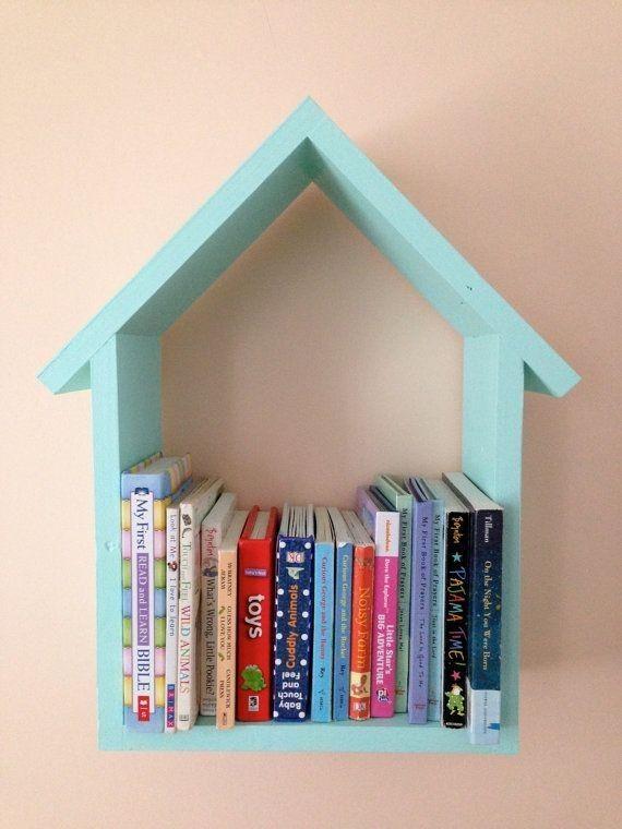 #KidsBookshelf #NurseryDecor #WallMountedRack #ReadingCorner #HouseShelfDesign #TurquoiseAccent #ChildrensRoomStyle #BookDisplayIdeas #PlayfulStorage #EducationalDecor